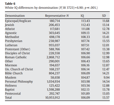 §1.4.3.3 Zůstává však otázkou, zda má na tyto rozdíly vliv samotné teologické učení církve. Spíše bych hádal, že původní “zakladatelská“ imigrantská populace byla hold inteligentnější a kvůli tendenci lidí hledat si partnery v stejné víře si své značně nadprůměrné schopnosti zachovala.