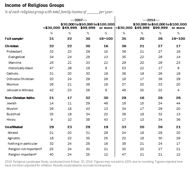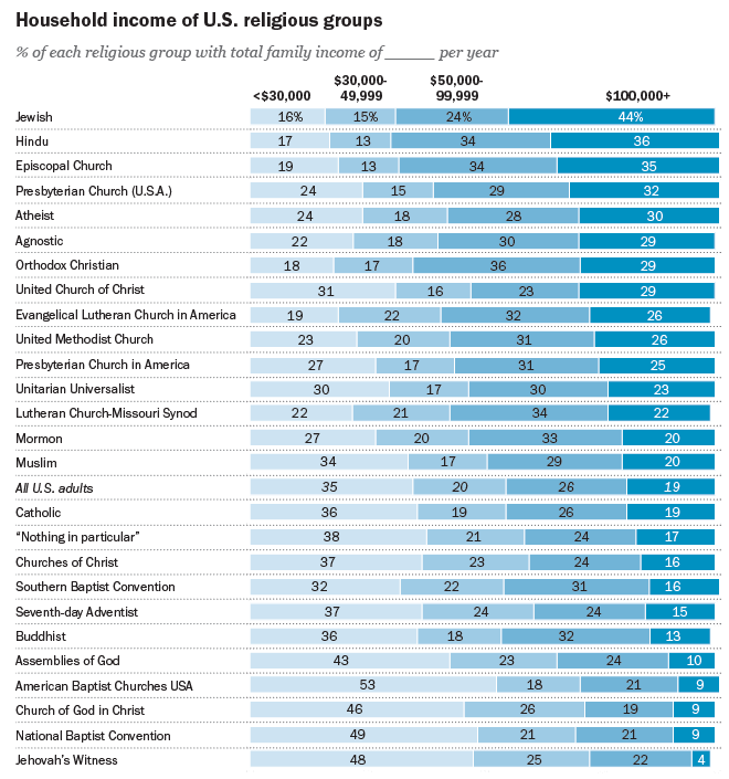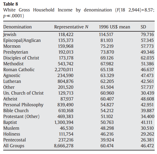§1.1.0.3 Když se vrátíme do současnosti, v moderním USA není žádný rozdíl mezi příjmy katolíků a protestantů15. Mezi protestanty je však velká diverzita. Např. United Church of Christ má o 10 % více členů v nejvyšší příjmové skupině než katolíci. Ale o celých 20 % rozdíl oproti (protestantské) National Baptist Convention16. V jiné studii Američanů mají Anglikáné příjmy o třetinu výše nad průměrem, zatímco pentacostálové o třetinu pod ním17.