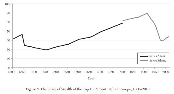§1.1.0.1 Tedy celý růst svatého HDP byl po většinu novověku jen rozšiřování jmění nejbohatší elity. Odhady hovoří, že v 19. století se mohla ekonomickou nerovnost dostat na trojnásobek současné v ČR (GINI = 2511)12. Výjimkou byl akorát šok po úmrtí 45 %13 populace při Černé smrti.