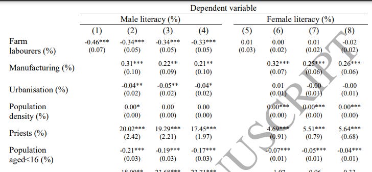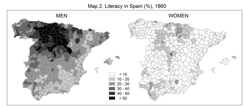 §1.3.0.3 Třeba v katolickém Španělsku byla ještě v roce 1860 většina lidí negramotná. Co je však zajímavé, je pozitivní vliv kněží v populaci na gramotnost26. I v jiné studii tento efekt v 19. století století potvrzují27.