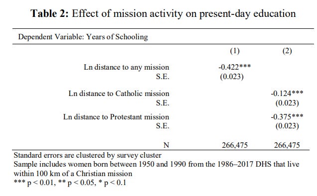 V sub-sahararské Africe mají protestanští misionáři 3× větší efekt na dobu vzdělání místních oproti katolickým.29
