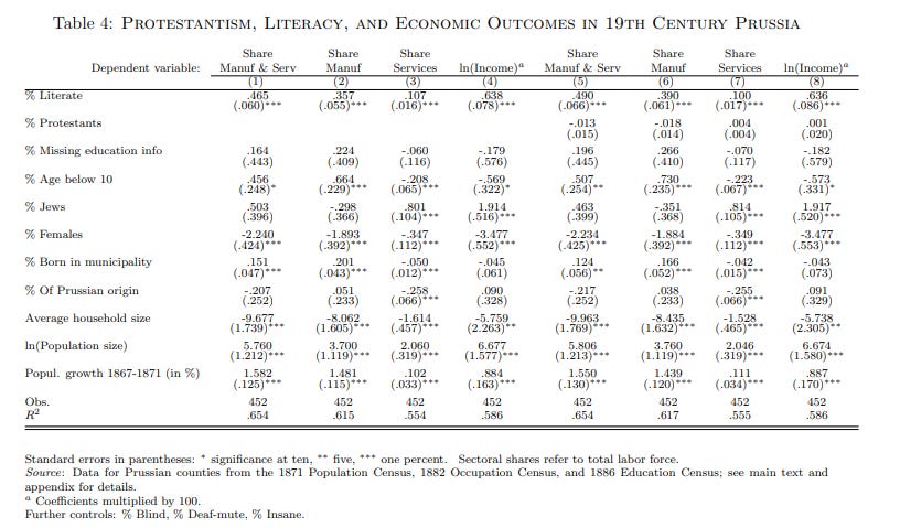 Results for our main measure of economic outcome [v Německu], per capita income tax receipts in 1877, generally point to very small effects of Protestantism after adjustment for literacy differences.
