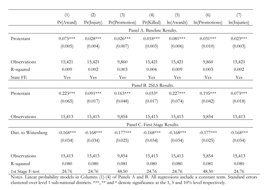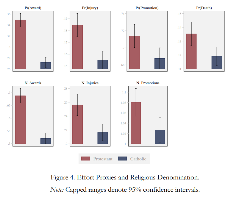 §1.2.0.2 Další způsob, jak odhadnou větší dříčství protestantů, je kariérismus ve válce. Kde vás touha za povýšením může stát i život. To však pro protestanty je trochu více přijatelné než pro katolíky. Proto měli v nacistickém Německu za 2. světové války vyznamenání o 7,5 % častěji než katolíci. Pokud jde o počet vyznamení, měli jich 1,3x více. Povýšení se jim dostalo o 2,6 % více, ale také byli o 2,8 % častěji zraněni22.
