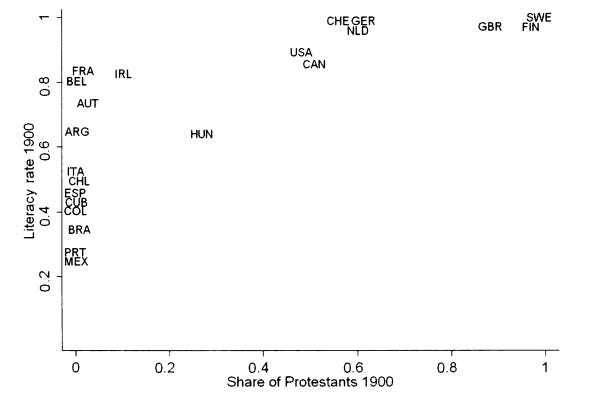 The correlation coefficient between Protestantism and literacy across the 22 countries with available data in 1900 is as high as .78 (statistically significant at the 1% level).