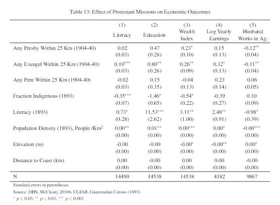 §1.1.0.4 Zajímavý způsob studování vlivu náboženství na populaci je sledovat působení misionářů v nebílých zemích. Bohužel ani v Guatemale se nepotvrdil žádný jasný vztah mezi bohatstvím a protestanstvím. Stejně jako u USA zde však je diverzita mezi protestantskými denominacemi. Evangeličtí misionáři měli pozitivní vztah na jmění místních obyvatel. Ostatní nikoli18.