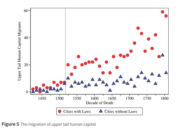 §2.0.0.0 Úpadek vlivu katolické církve měl i další blahodárný důsledek. A to je přesunutí sociálního státu, vzdělávání a různé administrativy po vymáhání morálky od “neziskového sektoru“ do rukou státu. To je více efektivní řešení problému, pokud se nebavíme o rozsáhlých státech s rozsáhlou agendou. Dle velkého srovnání německých měst je jasný vztah s růstem veřejných statků a imigrací elitní populace, růstem populace, počtem významných osobností per capita nebo publikace náboženských textů51.