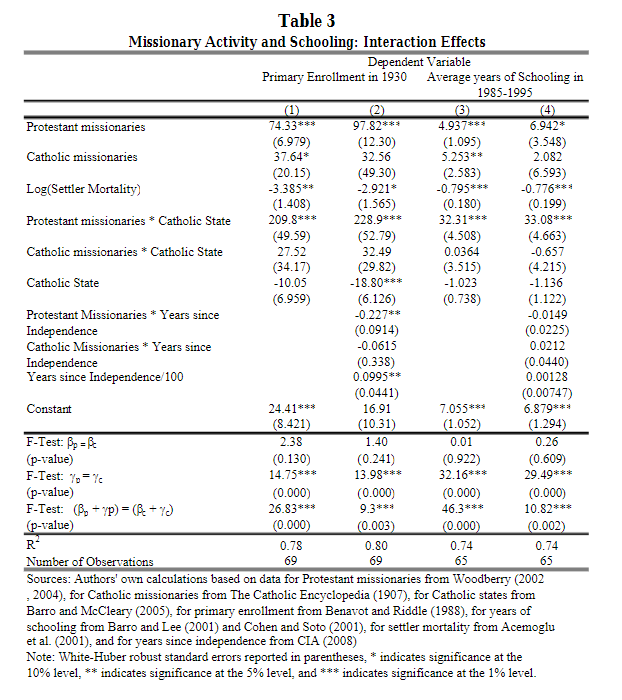 V rozsáhlé studii bývalých koloniálních teritorií měli protestantští misionáři 2× větší efekt na základní vzdělání a třikrát rozsáhlejší na dobu vzdělávání než katoličtí misionáři.30