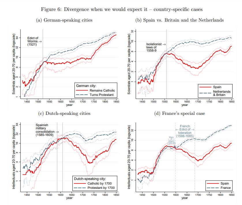 §2.0.0.1 Závěrem: Rozpad centralizované autority církve nepřímo vedl k společenskému pokroku v protestantských státech. Státy musely hledat více efektivnější řešení a oslabená schopnost identifikovat a vymáhat dogmata vedla k více svobodné diskuzi. Mezitím proti-reformace zcela poničila předchozí renesanční intelektuální a ekonomický růst.
