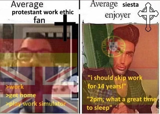 §1.2.0.3 Rozhodně to není tak, že by katolíci a ortodoxní křesťani utíkali po šesté hodině z práce domů. Oproti pracovní vytrvalosti mongoloidní rasy pod jejich domácími kuturami je mezi denominacemi spíše střídmý rozdíl.