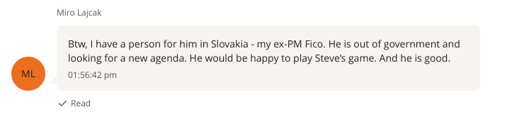 Epstein později oznamoval Bannonovi, aby se setkal s Ficem. Fico měl určitý pro-vlastenecký re-brand. Třeba mu Bannon pomohl s Epsteinovými penězi?