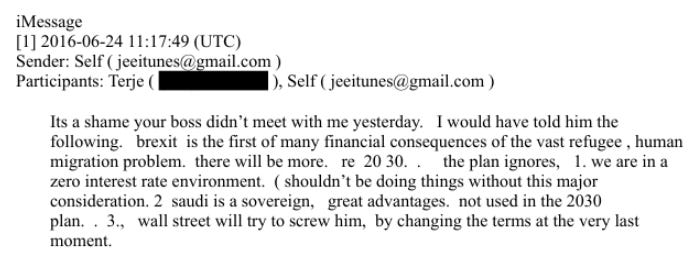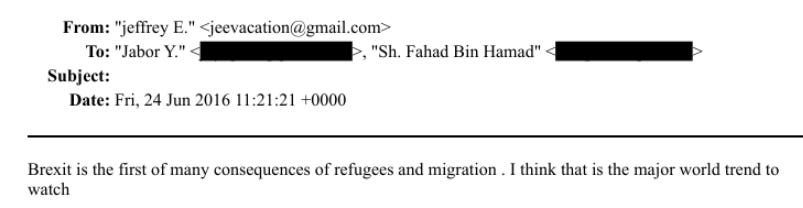 Epstein viděl nezvládnutou imigraci jako rozbušku velkých politických změn. Viz jeho mail katarskému šejkovi Fahad bin Hamad bin Khalifa Al Thaniovi a dalšímu neznámému člověku z Kataru28: