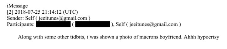 Nejprve se dostal do přímého kontaktu s francouzským ministrem, kterého se mi nepodařilo identifikovat12. Později se sešel s celou Macronovou vládou v Paříži 5 měsíců před jeho sebevraždou13 a sám s Macronem14. V chatu se také pochlubil fotkou s Jackem Langem z Parti socialiste. Další maily ukazují komunikaci s dcerou Langa (Caroline)15.