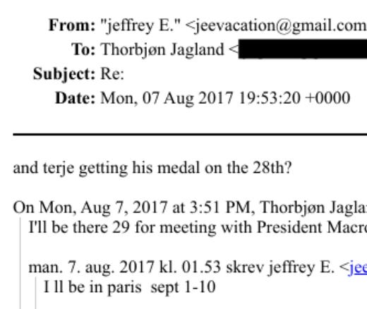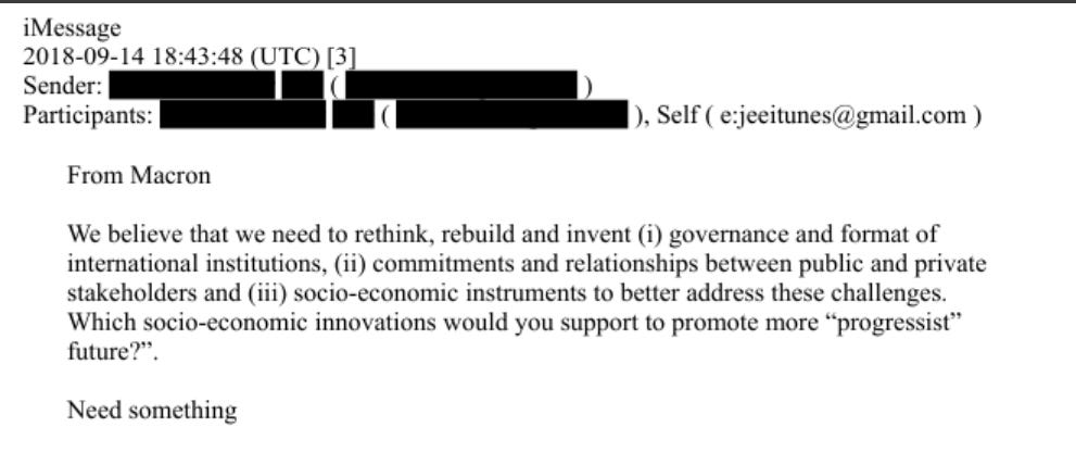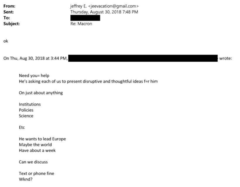 Macron v srpnu a září 2018 kontaktoval lidi z Epsteinova kruhu a víceméně se jich ptal, jaké má nápady k stvoření “progresivní budoucnosti” pro Francii - instituce, politická agenda, věda. Jeho sen byl být vůdcem Evropy. Viz tyto tři maily16: