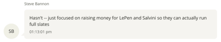Další chaty ukazují, že Bannon se snažil získat peníze nejen pro Le Penovou, ale i pro Salviniho36: