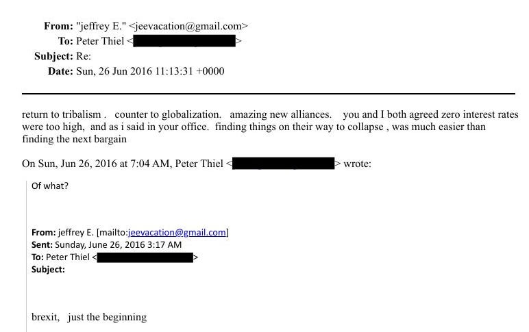 Vraťme se do Evropy. Zde je v konverzaci s Peterem Thielem psáno, jak Epstein vidí chaos způsobený Brexitem a obecně rozpad liberální hegemonie v EU jako příležitost k zisku a nalezení nových pozic vlivu11:
