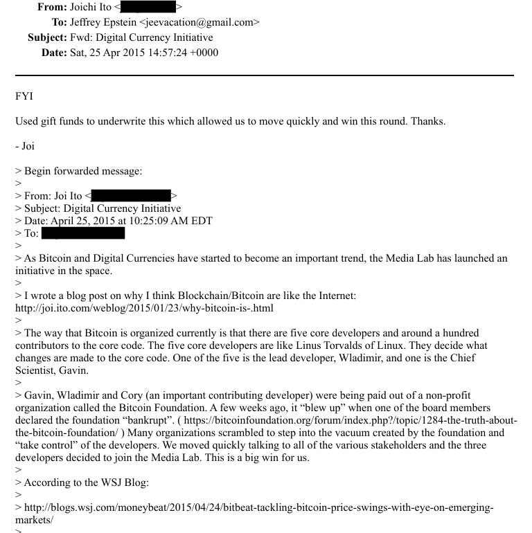 Jiné maily poukazují, že Epstein se hodně zajímal o Bitcoin a vedl korespondenci s japonským businessmanem Joichi Ito, kde řešili získání kontroly nad vývojem Bitcoinu25. To se do určité míry podařilo. Po bankrotu Bitcoin Foundation v roce 2014 Epstein daroval Joichimu Ito peníze, kterými získal vývojáře na svou stranu (viz obrázek níže). Ethereum Epstein řešil ještě pár dní před jeho oficiálním vydáním26. Epsteinův cíl bylo stát u zrodu nového finančního systému. Přestárlí bankéři by se snažili pochopit fungování kryptoměn, zatímco Epstein by měl bleeding-edge informace přímo od nejvlivnějších lidí v Silicon Valley27. Znovu ještě připomínám, že motivace Epsteina mohla být jen jeho zájem o technologický pokrok.