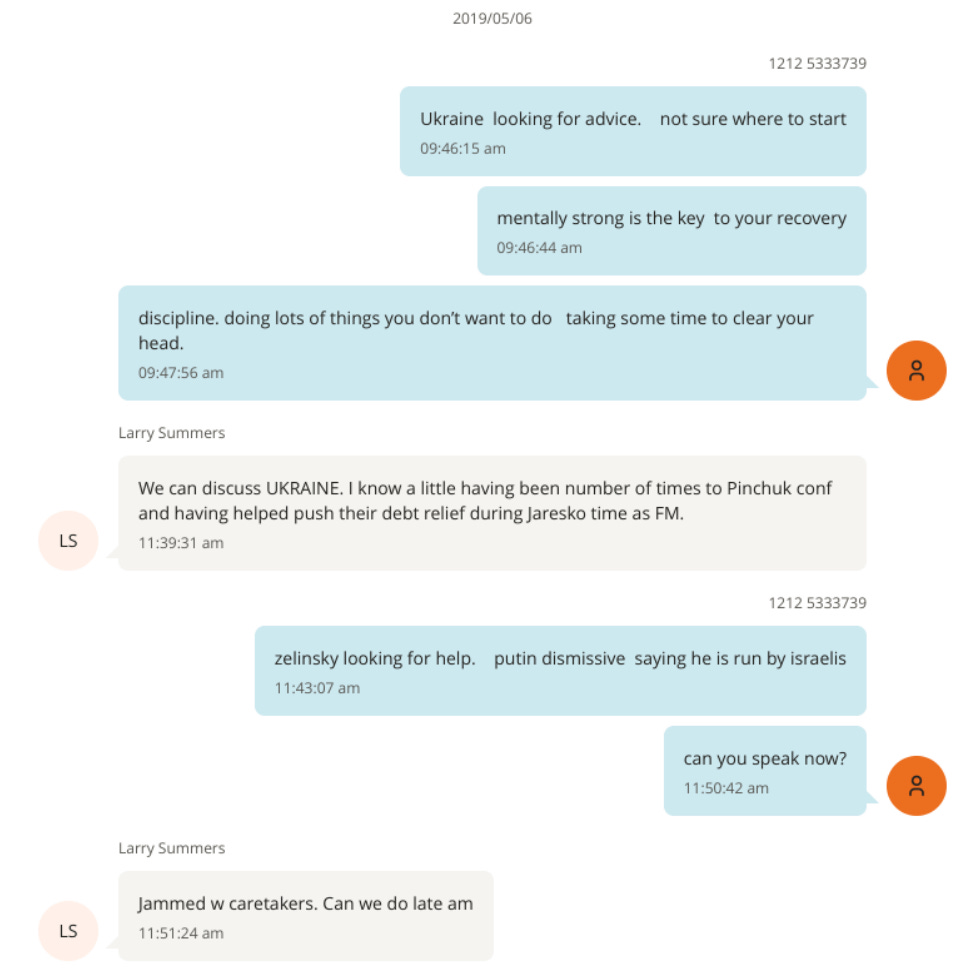 V roce 2019 - pár měsíců před údajnou smrtí Epsteina - řešil s Larry Summersem Zelenského. Prý žádá o pomoc. Bohužel pozdější vývin události neznáme.51