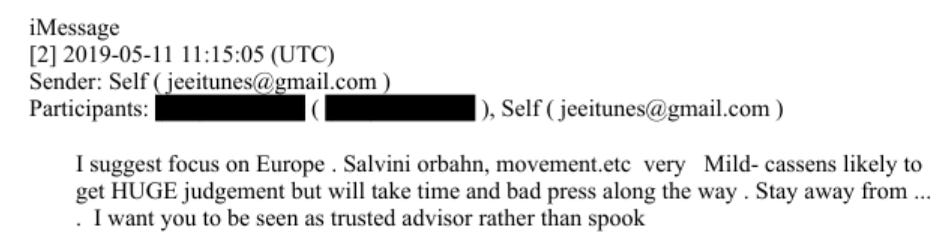Epstein si i dělal srandu, že Bannon by měl napsat druhý díl Kupce Benátského. Nejspíše referoval na to, že on je mocný židovský amorální bankéř, který financoval riskatní deal se stranou Lega? Bannon se s Salvinim setkal vícekrát37. Jednou v Miláně, a pak spolu letěli navštívit Národní Frontu ve Francii38.