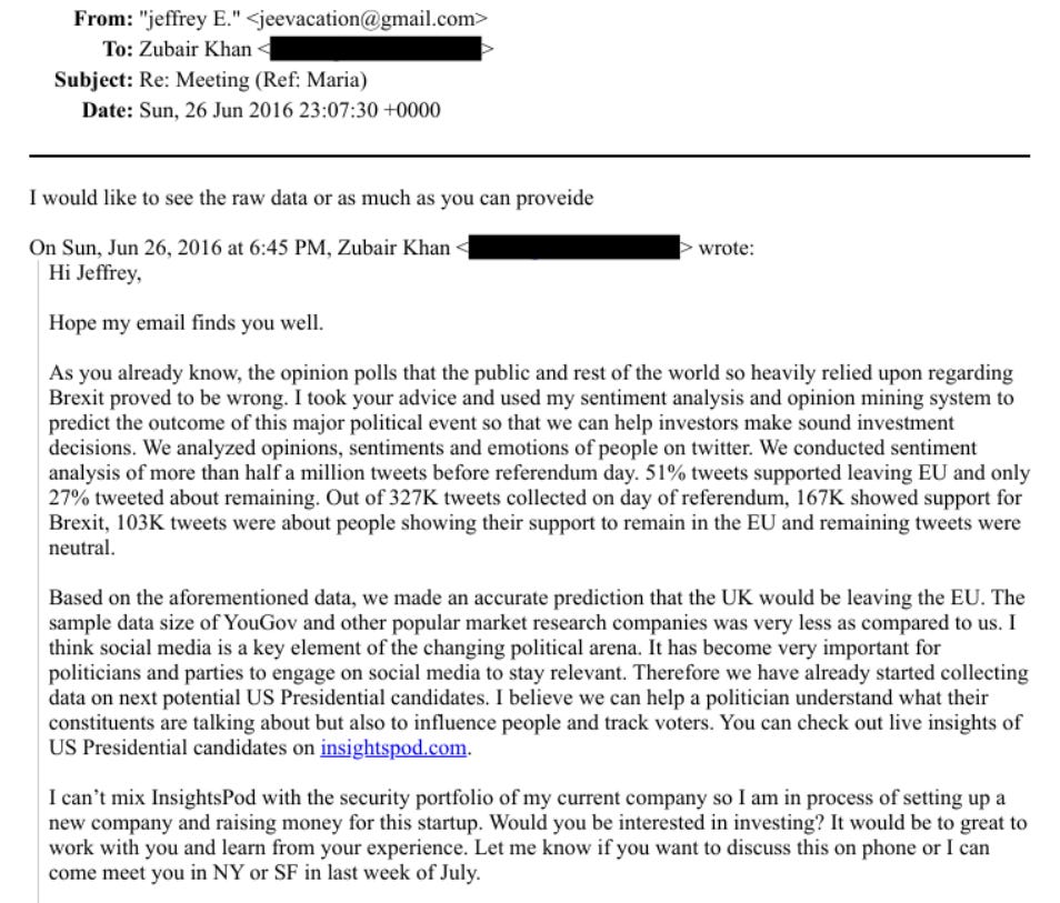 Epstein ale pečlivě monitoroval situaci kolem něj. Šel tak daleko, že podpořil vývoj softwaru, který sledoval trendy na sociálních sítích v Británii, aby správně předpověděl výsledek referenda o EU. Údajně byl přesnější než tradiční volební průzkumy54. Nic nenaznačuje, že by se ale aktivně snažil prosadit nějakou politiku.