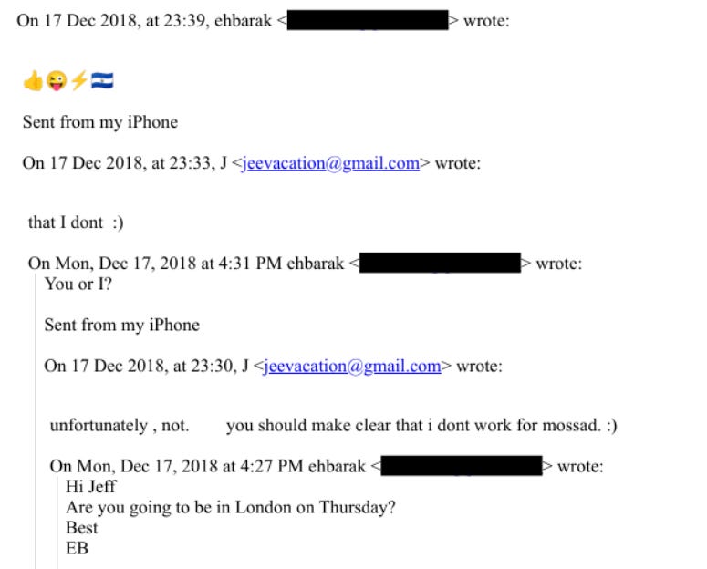V dalším mailu Epstein vtipkuje s bývalým izraelským premiérem (a jeho velmi častým korespondentem), že by měl v Londýně ujasnit, že nespolupracuje s Mossadem7: