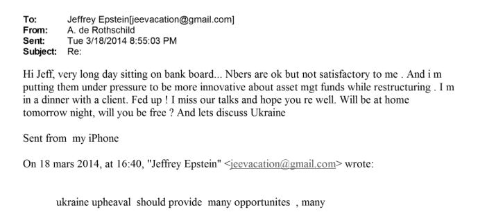 Měnící se situaci na Ukrajině po Majdanu viděl Epstein jako velkou finanční příležitost. Zde je konverzace s de Rothschildovou49: