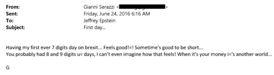 Epstein a jeho známí diskutovali o Brexitu hlavně jako o ekonomické události, na které musí vydělat52. Např.